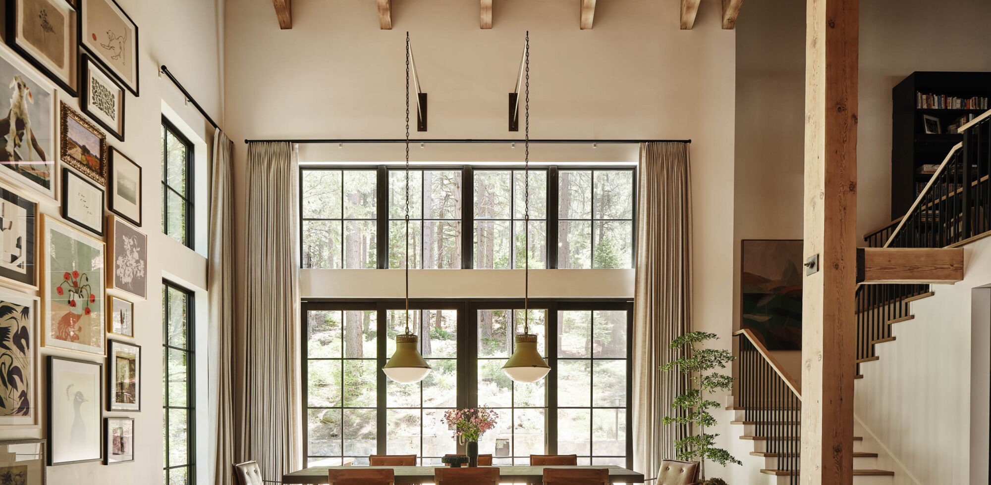 Masculine and feminine tension is at play with a preppy clubhouse-like feel contrasted with a more feminine, floral aesthetic, all grounded by warmth originating from the interior wood finishes and forest and mountains beyond.