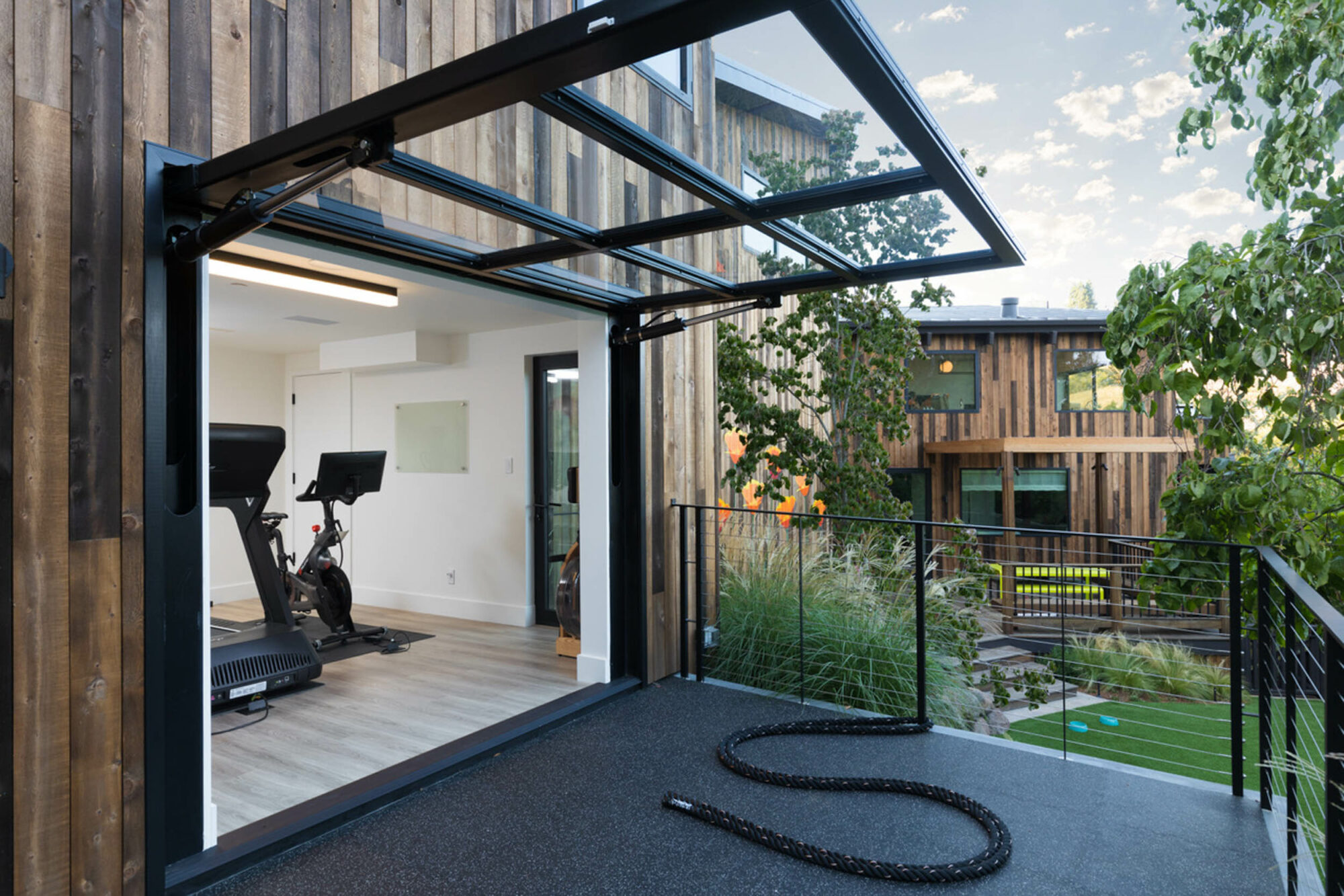 The hangar door that can be opened rain or shine with sports court material on the outdoor portion doubles the gym's space. The rowing machine can be rolled out to the deck, along with yoga/mat work and ropes, with the weights and bosu ball placed on the back wall, out of sight while working out.