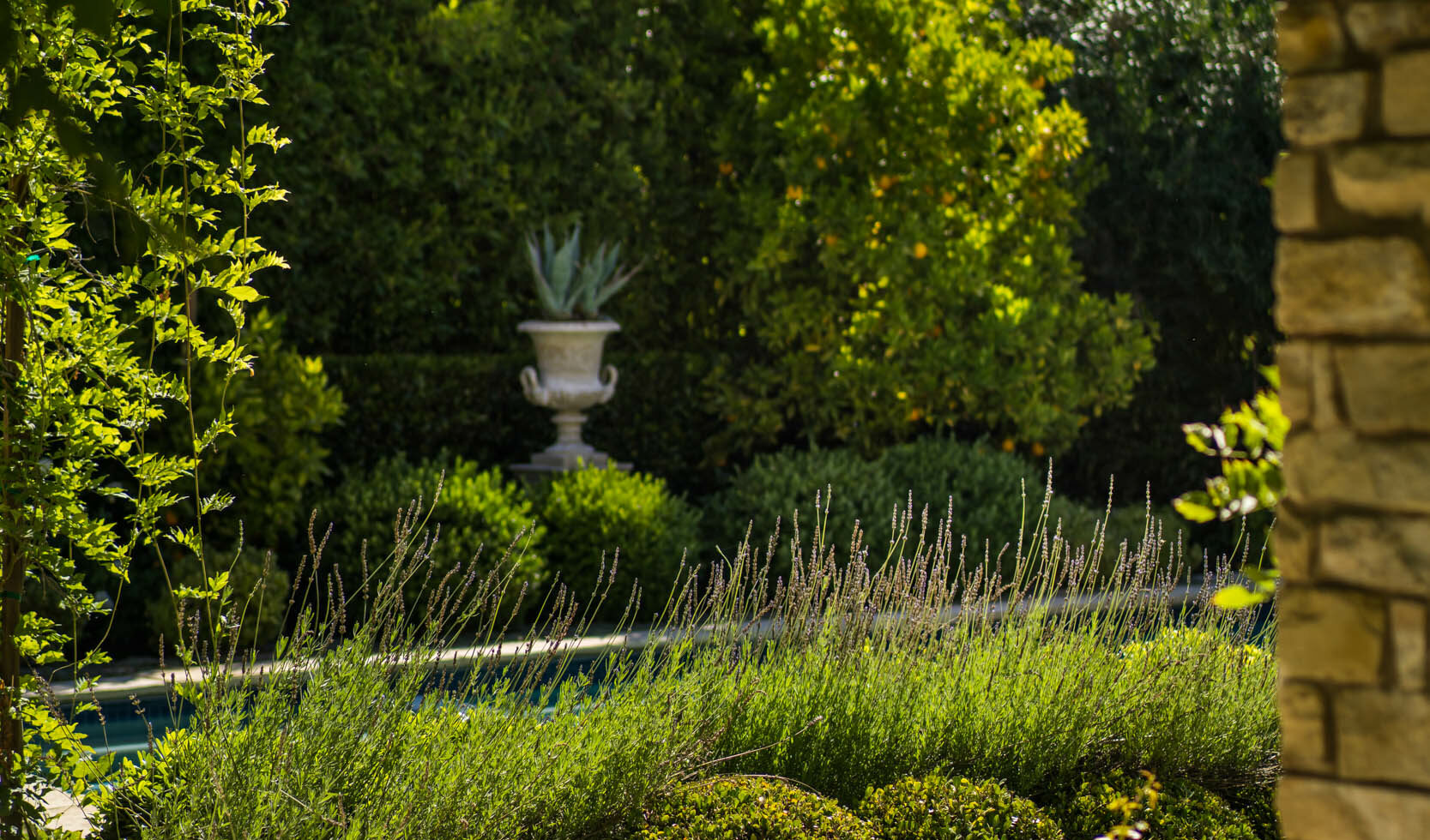 At an intimate wine country retreat in St. Helena, Douglas created a series of raised planters constructed from redwood beams, situated around a central stone fountain that attracts butterflies and hummingbirds. “The strong geometry elevates the space, making it look as elegant and sophisticated as any ornamental element,” says Douglas of a garden that achieves a delicate balance of rusticity and refinement.