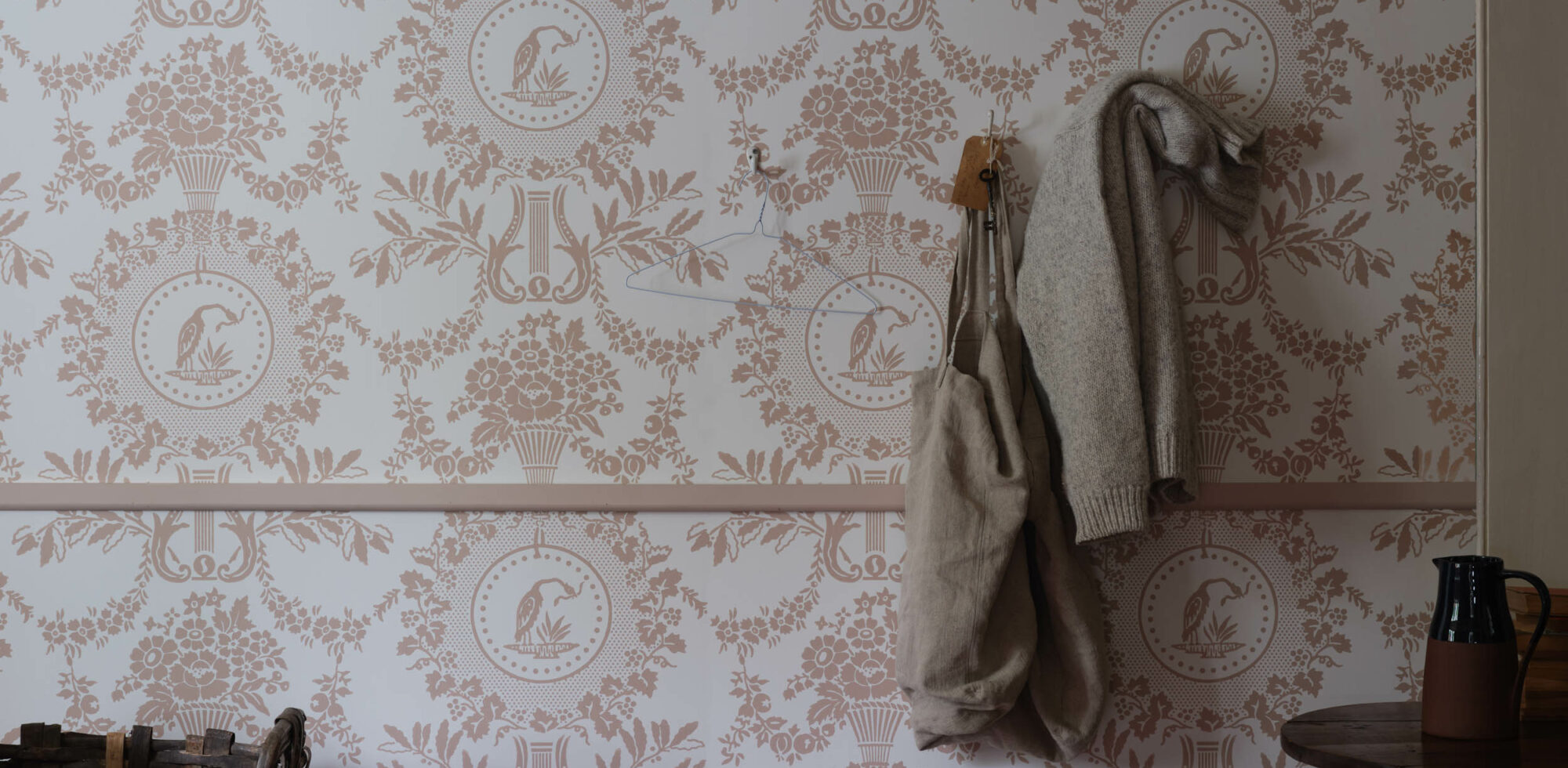 The traditional methods of production used by Farrow & Ball replicate the original papers' texture, depth, and feel. The new wallpapers are made using roller blocks or flatbed printing with paint, depending on the pattern. The most striking pattern of the collection is Purnon, named after the Chateau. Featuring classical elements that symbolize peace, abundance, and prosperity. In contrast, Adelaide is an abstract floral pattern bigger and bolder than the original inspiration while retaining a delicate charm.