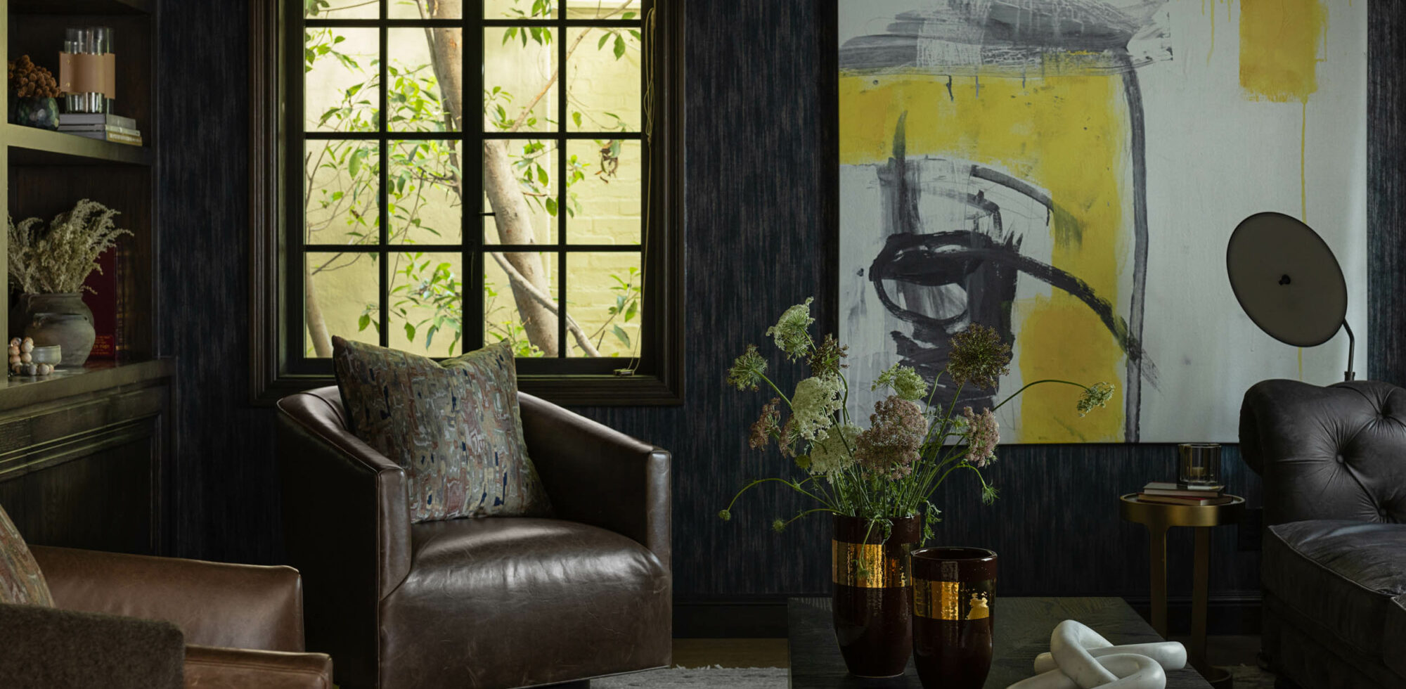 Part of the success, Klein says, is “maximizing natural light in lighter rooms and then using accent and ambiance lighting in darker rooms,” such as the Apparatus flush mount fixture in the library. Also, intermediary shades on furniture and accessories complement both dark and light spaces, helping tie things together. In looking at the big picture, it was key to maintain open sightlines between the darker and lighter rooms, so the transitions were seamless.