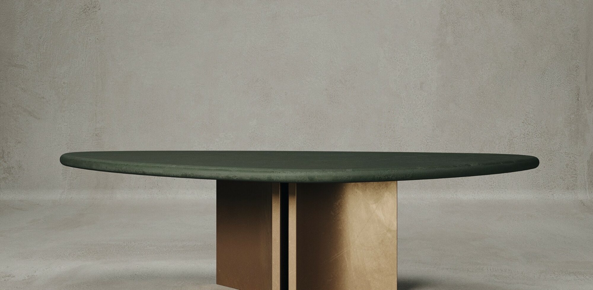 Belgian designer Tommy Muyters design is inspired by organic, sculptural lines with detailed proportion and balance. The Concept 1.2 dining table has a signature brass base with a stone top.